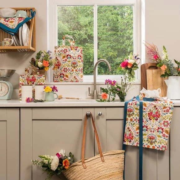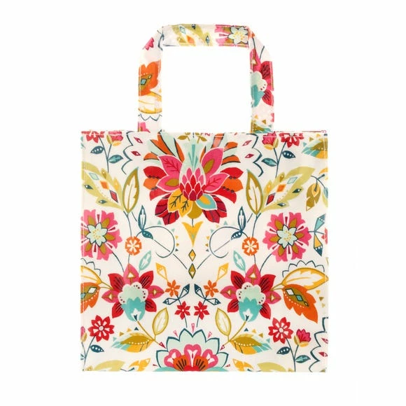 Designed by Ulster Weavers, this small PVC reusable shopping bag is part of the Bountiful Floral collection and features an array of brightly coloured flowers adorn a cream background, inspired by traditional Arts and Crafts designs but with a modern twist of colour. Designed from 100% cotton with PVC coating, this extremely practical PVC resuable shopping bag is a great alternative to buying plastic bags and comes complete with a magnetic clasp for closing and inner pocket with zip fastening.