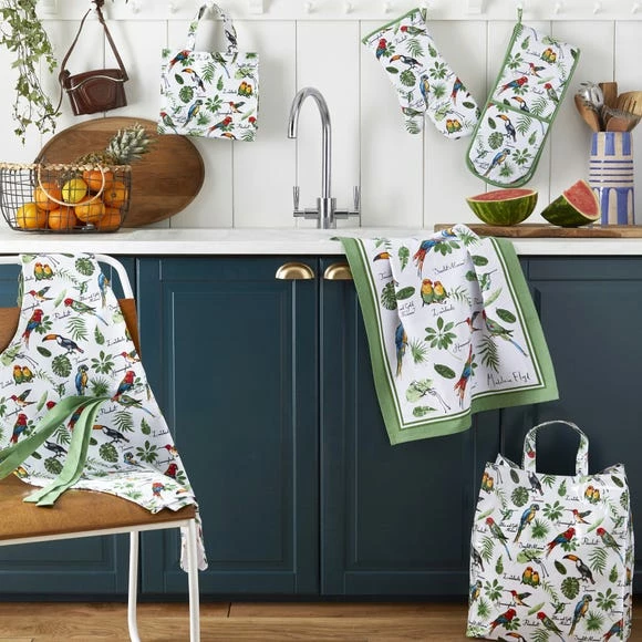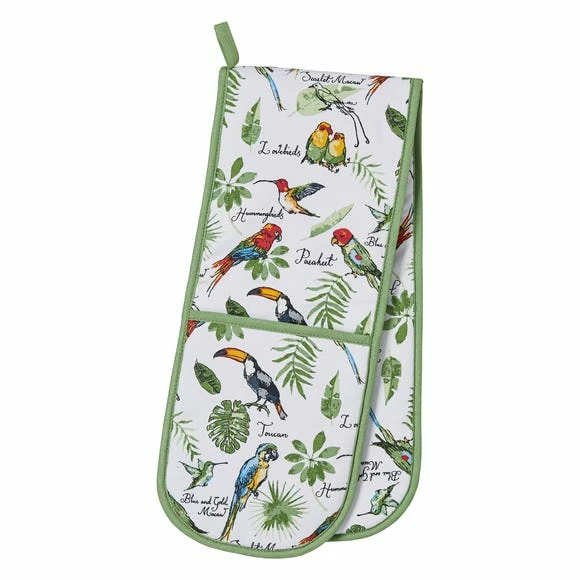 Bursting with colour and personality, this 100% cotton Tropical Birds double oven glove is a refreshing addition to any kitchen. This product is machine washable. Co-ordinating products are available for purchase.