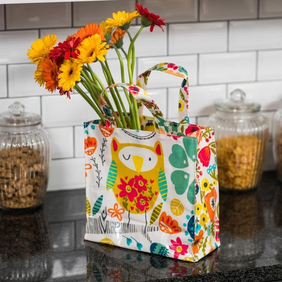 Designed by Ulster Weavers from 100% cotton with PVC coating, this PVC small reusable bag has been designed with a magnetic clasp for closing and an inner pocket with zip fastening for added storage. Easy to wipe clean when required, this small reusable bag is part of the Twit Twoo collection and has been finished with bright and colourful, cute owl illustrations with co-ordinating items available to purchase separately.