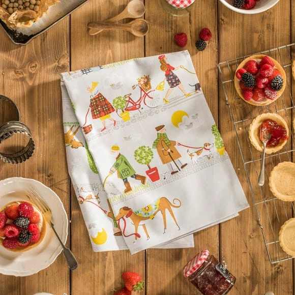 Featuring a colourful, charming dog-walking design, this 100% cotton tea towel is ideal for adding a splash of colour to your kitchen. This product is machine washable. Co-ordinating products are available for purchase.